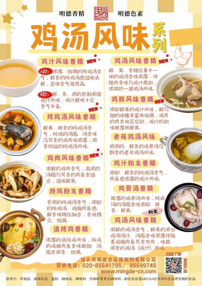 明德雞湯風味香精 濃郁鮮香 還原地道雞湯本味汕頭市明德食品添加劑有限公司的雞湯風味香精系列,涵蓋雞汁、雞湯、雞鮮風味、老母雞湯、雞肉風味、雞粉末、雞骨湯、清燉雞等多種品類。產品具備真實的雞肉鮮香、湯香、油香與骨香特征,能夠為醬料、調味品、肉制品、腌制料及復合調味料等B端應用提供穩定、濃郁的雞湯風味解決方案,幫助工廠快速打造風味醇厚、回味悠長的雞香產品。